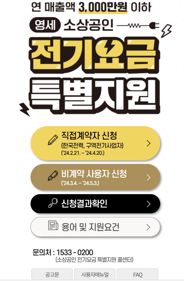 ① 공고일 기준 활동 중이고, ② 연 매출액이 3,000만원 이하이며, ③ 사업장용 전기요금 (주거용 등 제외)을