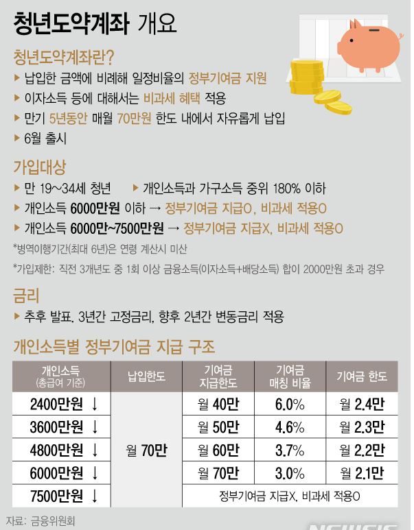 청년도약계좌는 청년의 자립과 경제적 재정 등 청년의 자율적인 경제활동을 지원하고자 정부에서 운영하는 예금상품입니다. 청년들의 미래를 준비하는데 도움(支援)이 될 수 있는 자금을 미리 모아두는 계좌로, 저축이나 예,적금 상품의 형태로 운영됩니다. 청년도약계좌가 처음 등장한 것은 지난해 대통령 선거 당시였습니다. 윤석열 대통령의 대선 공약 중 하나로 제시됐는데, 원래는 최대 10년 동안 매월 30만~60만원을 저축하면 정부가 10만~40만원의 장려금을 지원해 총 '1억원'을 만들 수 있는 상품으로 소개됐었죠. 파격적인 혜택으로 '1억통장'이라는 별명이 붙었고, 구체적인 출시 시기나 조건이 정해지지 않았음에도 '청도계'(청년도약계좌 줄임말)라는 온라인 커뮤니티까지 개설되며 뜨거운 관심과 기대를 한 몸에 받았습니다. 결국 다음달 출시를 앞둔 청년도약계좌는 개인소득이 6000만원 이하인 청년이 5년간 매월 40만~70만원을 꼬박꼬박 내면 정부기여금 최대 6%, 비과세를 혜택을 적용하게 됐습니다. 예컨데 연소득이 2400만원 이하인 청년이 매월 40만원을 납입한다면, 매칭비율이 최대 수준인 6%가 적용돼 매월 2만4000원씩 정부로부터 지원받을 수 있는 것이죠. 개인소득 기준 6000만~7500만원인 경우는 정부기여금 지원금은 없고, 비과세 혜택만 받을 수 있습니다. 5년 만기 전 중도해지 할 경우, 일부 사유를 제외하곤 정부 기여금과 비과세 혜택을 받을 수 없다는 점도 유념해야 합니다. 이 특별중도해지 요건에 해당되는 사유는 ▲가입자의 사망·해외이주 ▲가입자의 퇴직 ▲사업장의 폐업 ▲천재지변 ▲장기치료가 필요한 질병 ▲생애최초 주택구입 등입니다. 일각에선 제도의 취지는 좋지만, 젊은층이 매월 40만~70만원을 만기까지 낼 수 있을지 의문이란 시선도 나오고 있습니다.