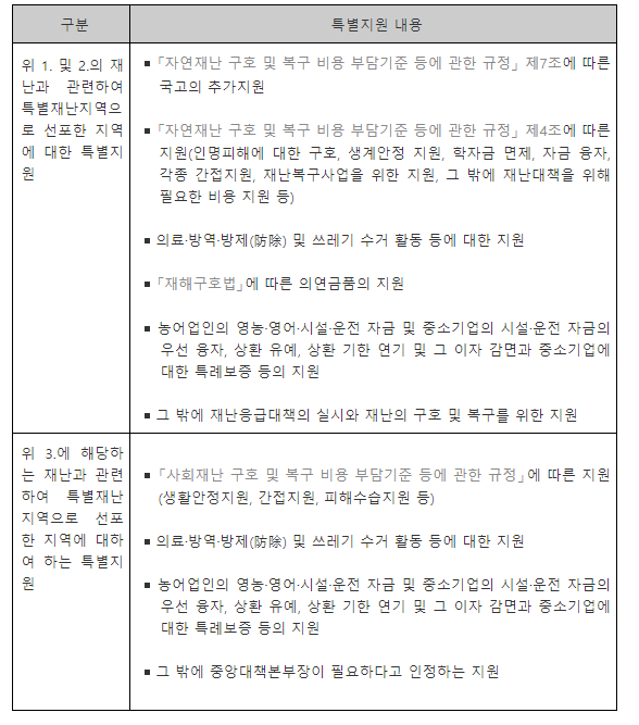 세부적으로 특별재난지역은 일반 재난지역에서 실시하는 국세납부 예외, 지방세 감면 등 18가지